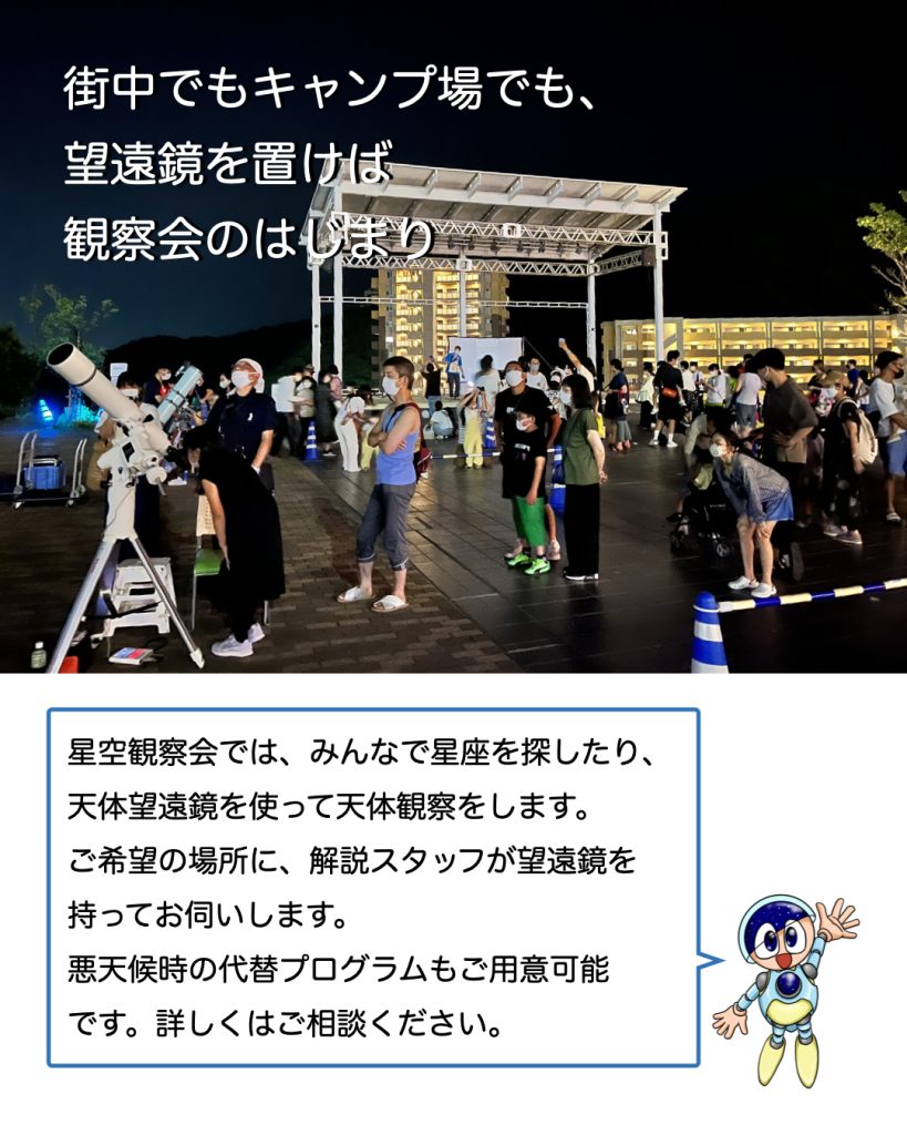 星空観察会は、天体望遠鏡など必要機材をお持ちして、星空観察会を開催するサービスです。悪天候で何もみることができない時のために代替プログラムもご用意します。